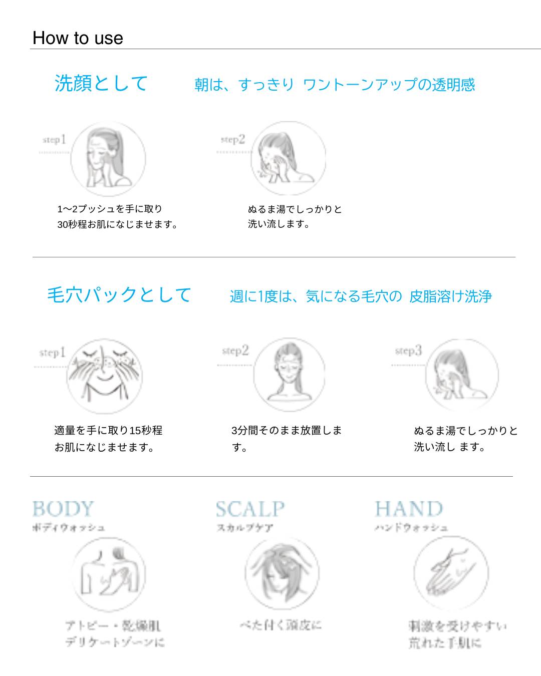 1〜2プッシュ程度手に取り30秒程度お肌に馴染ませ5分放置ます。 2.ぬるま湯でしっかりと洗い流します。